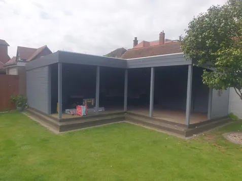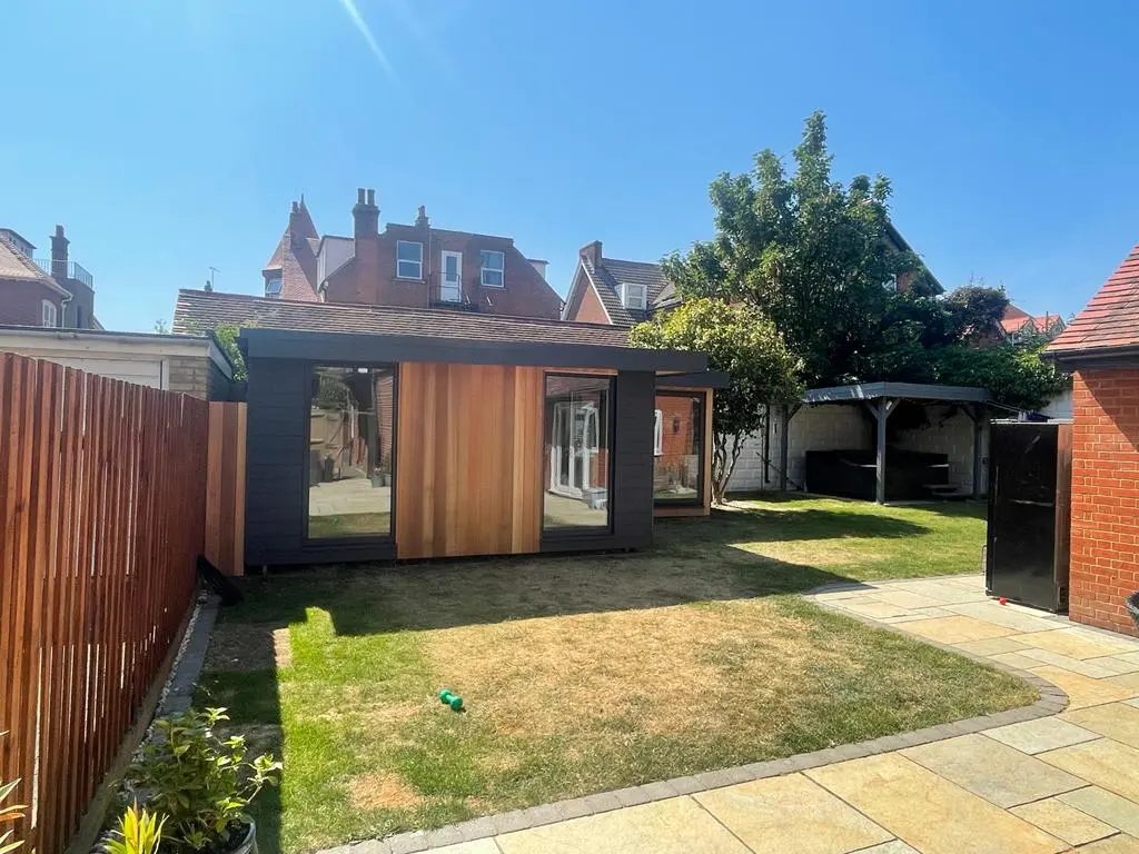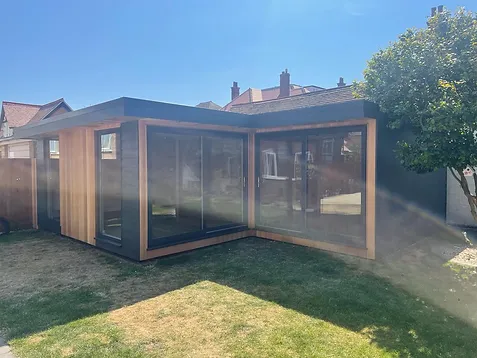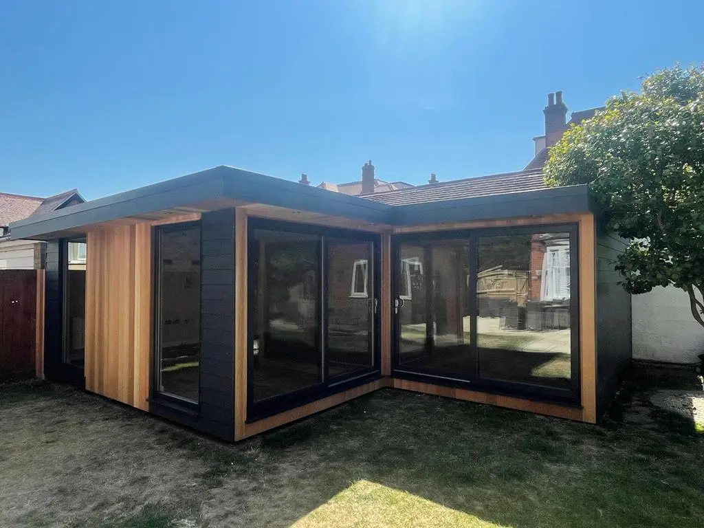 Here’s our latest Hybrid Hardiplank/Cedar room in Felixstowe, Suffolk. This stunning and modern “L” shaped design flawlessly combines the natural beauty of cedar cladding with the durability and versatility of Hardiplank cladding.
